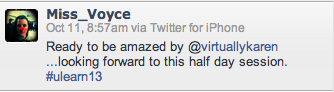 “Hi Karen – I attended your spotlight session, ‘Punch above your weight’, last week. I was wondering if you knew when the recording was going to be available online. You said a couple of things about professional learning that really struck a chord with me, and I would love to share some of your insights with my team. Cheers, SW, 2012